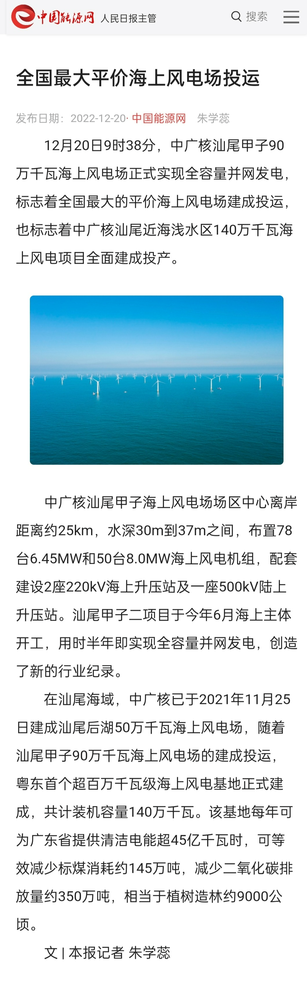 在汕尾海域,中廣核已于2021年11月25日建成汕尾后湖50萬千瓦海上風(fēng)電場,隨著汕尾甲子90萬千瓦海上風(fēng)電場的建成投運,粵東首個超百萬千瓦級海上風(fēng)電基地正式建成,共計裝機容量140萬千瓦。該基地每年可為廣東省提供清潔電能超45億千瓦時,可等效減少標(biāo)煤消耗約145萬噸,減少二氧化碳排放量約350萬噸,相當(dāng)于植樹造林約9000公頃。
