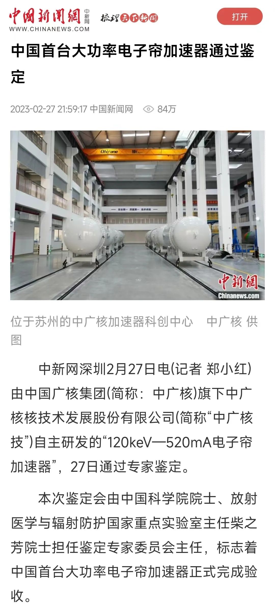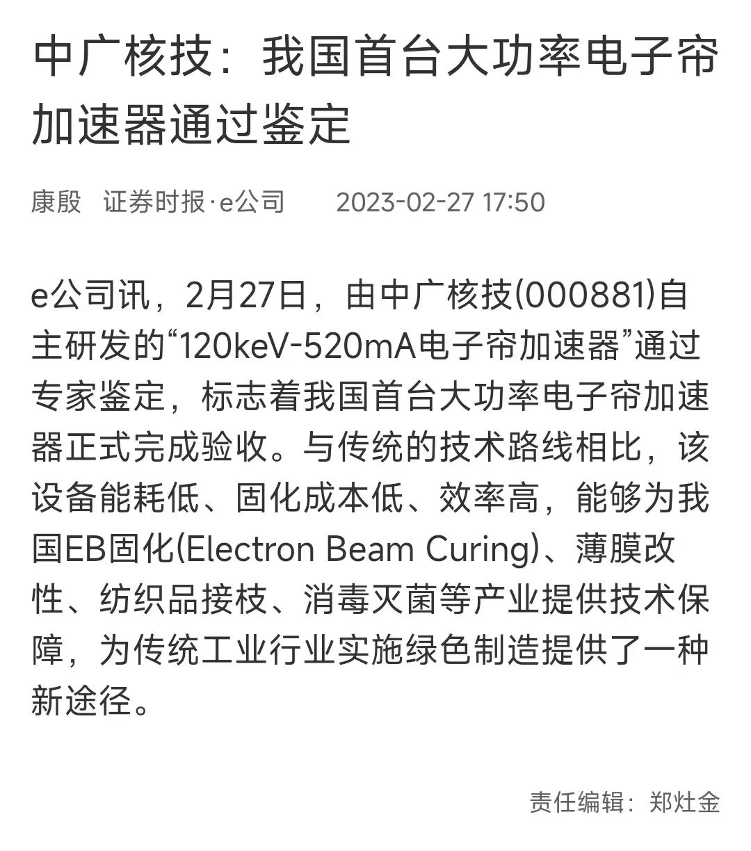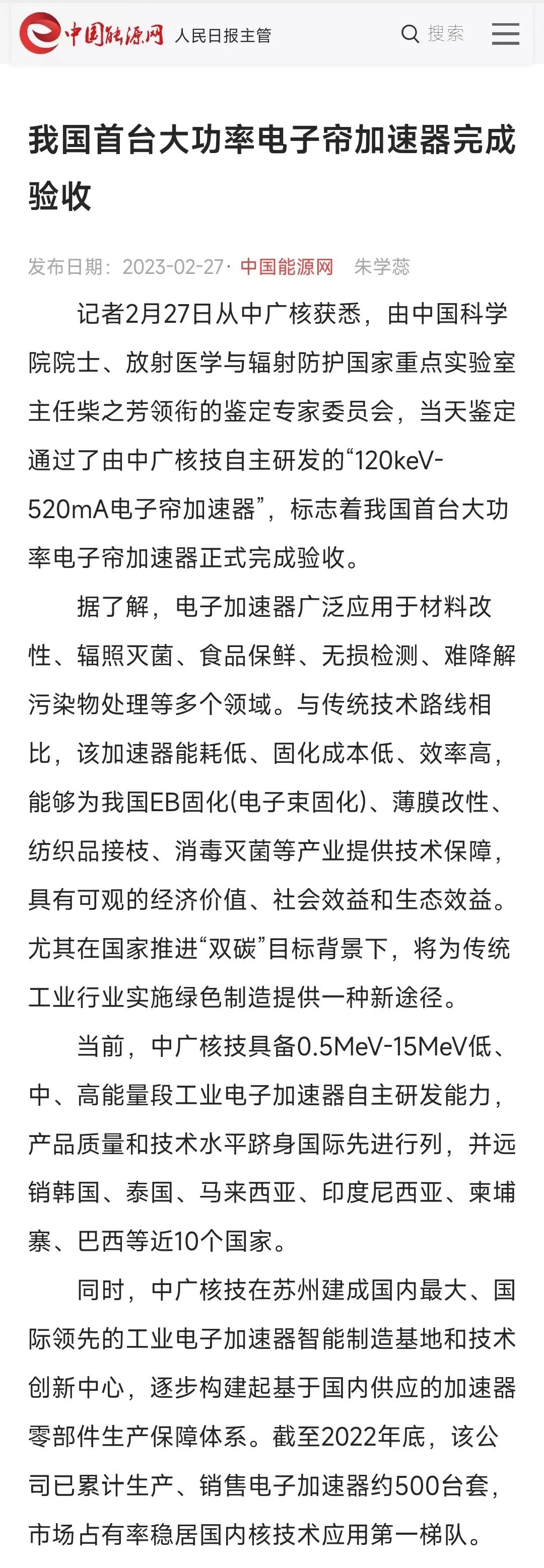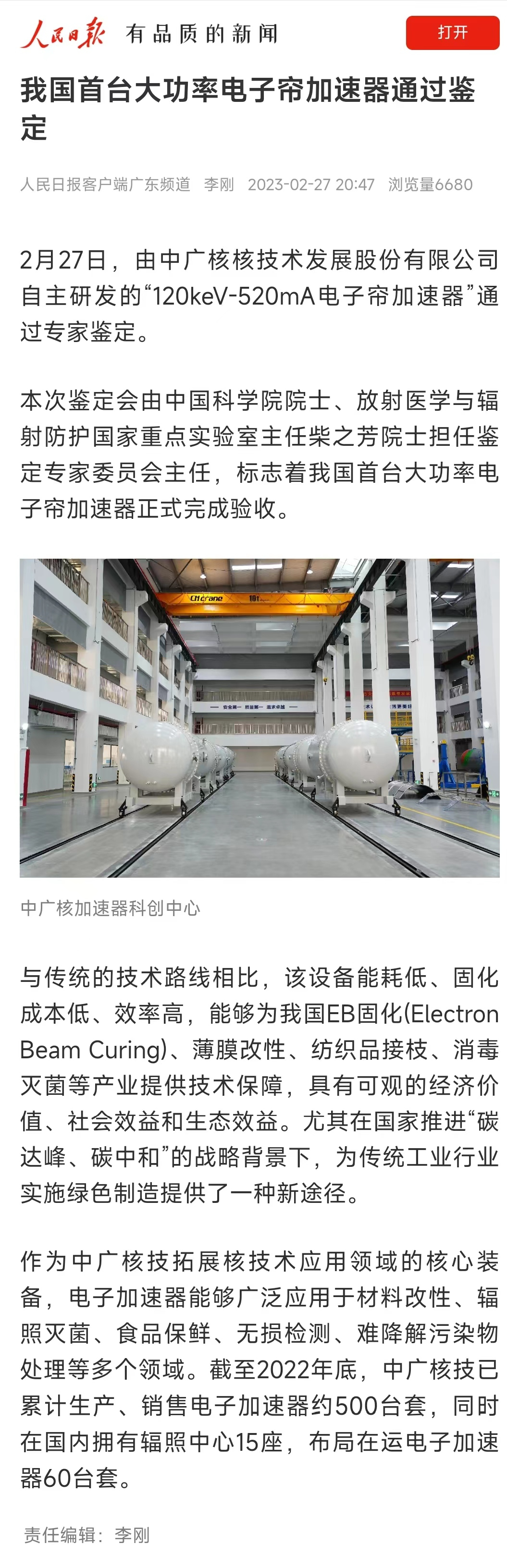 2月27日,由中廣核核技術(shù)發(fā)展股份有限公司(股票代碼:000881.SZ)聯(lián)合中科院近物所研發(fā)的“120keV-520mA電子簾加速器”通過專家鑒定。本次鑒定會由同輻行業(yè)協(xié)會組織,中國科學院院士、放射醫(yī)學與輻射防護國家重點實驗室主任柴之芳院士擔任鑒定專家委員會主任,標志著我國首臺大功率電子簾加速器正式完成驗收。與傳統(tǒng)的技術(shù)路線相比,該設(shè)備能耗低、固化成本低、效率高,能夠為我國EB固化(Electron Beam Curing)、薄膜改性、紡織品接枝、消毒滅菌等產(chǎn)業(yè)提供技術(shù)保障,具有可觀的經(jīng)濟價值、社會效益和生態(tài)效益。尤其在我國推進“碳達峰、碳中和”的戰(zhàn)略背景下,為傳統(tǒng)工業(yè)行業(yè)實施綠色制造提供了一種新途徑。