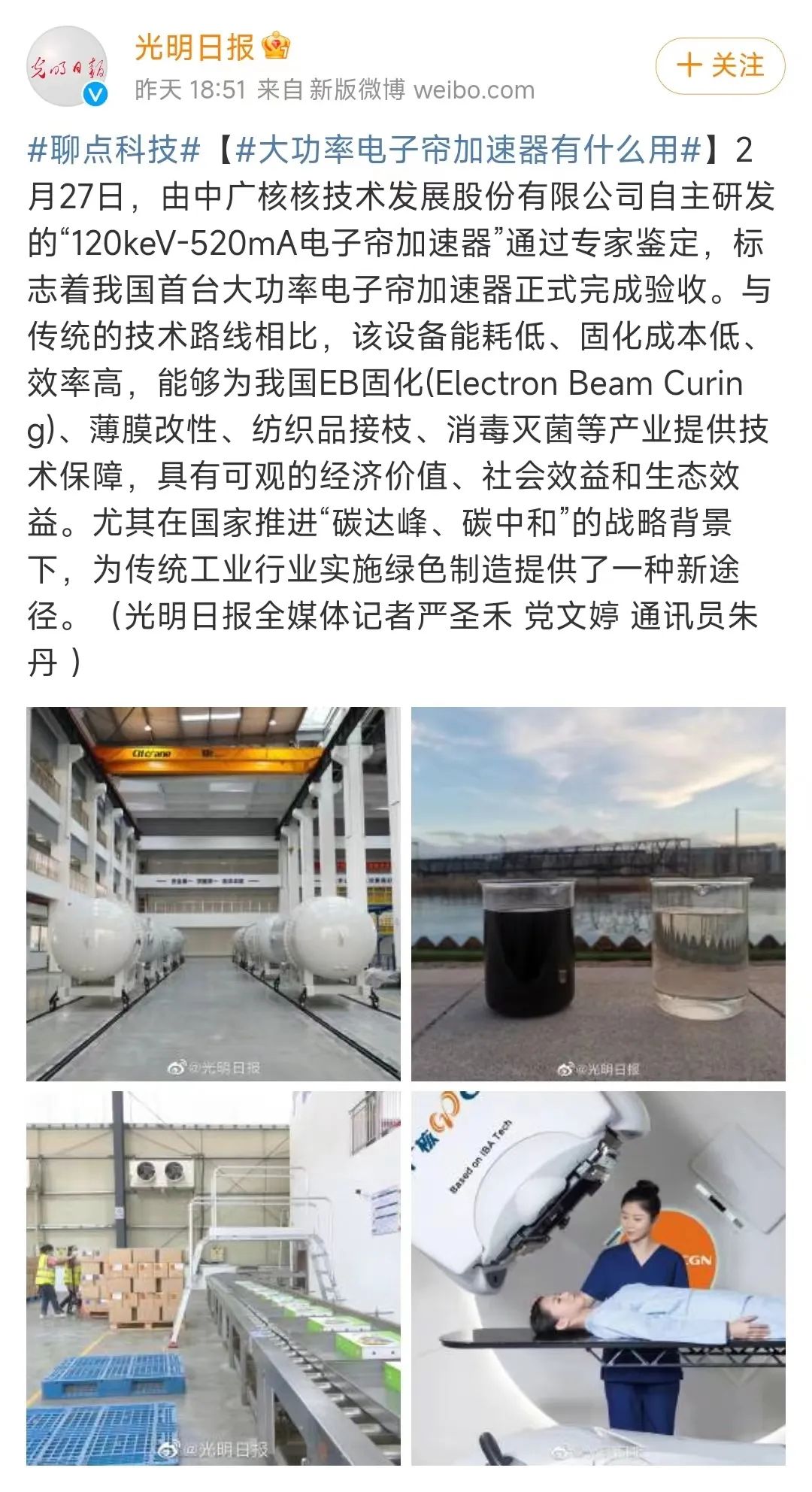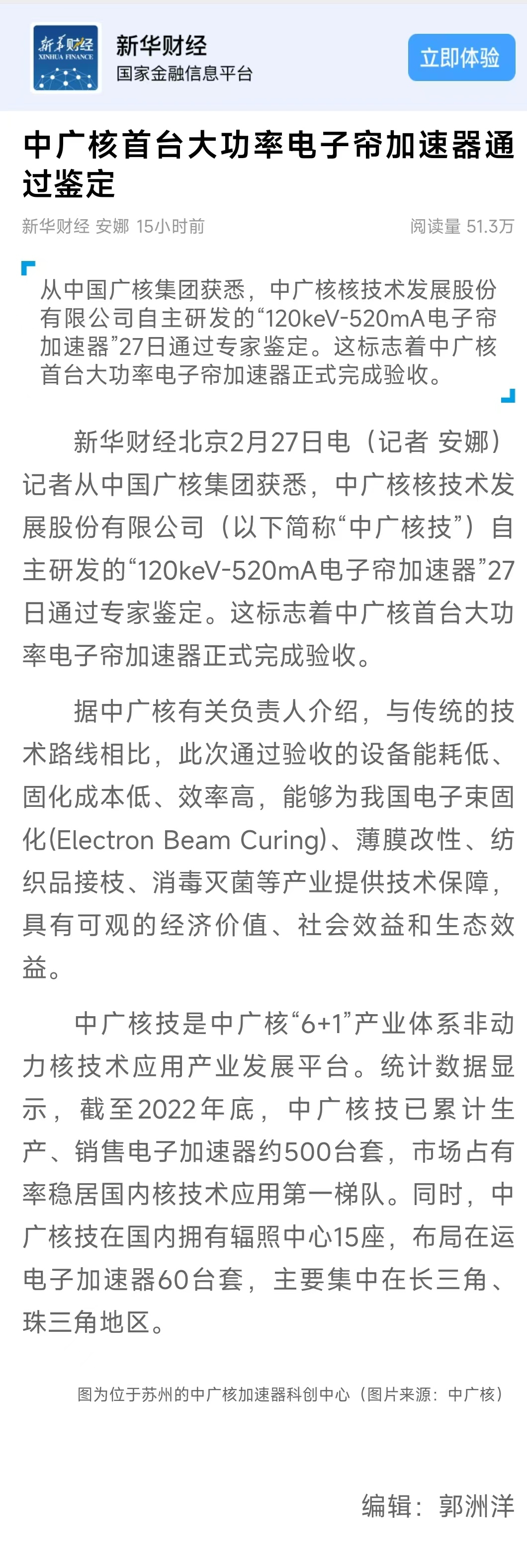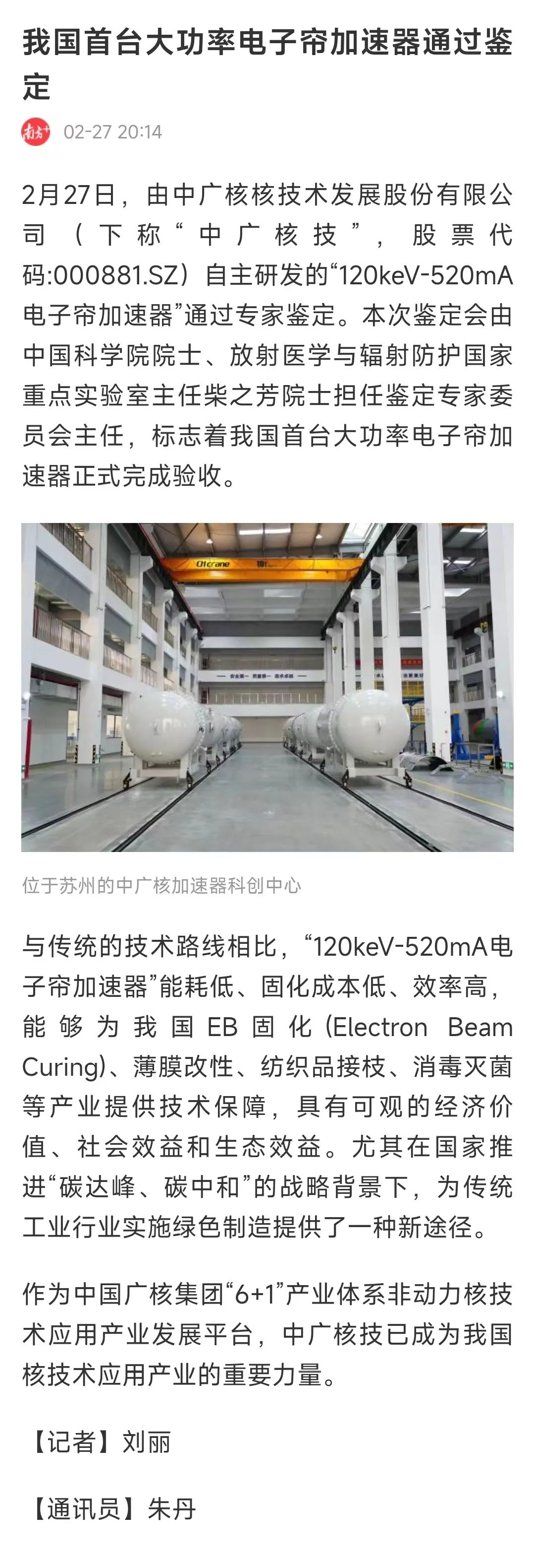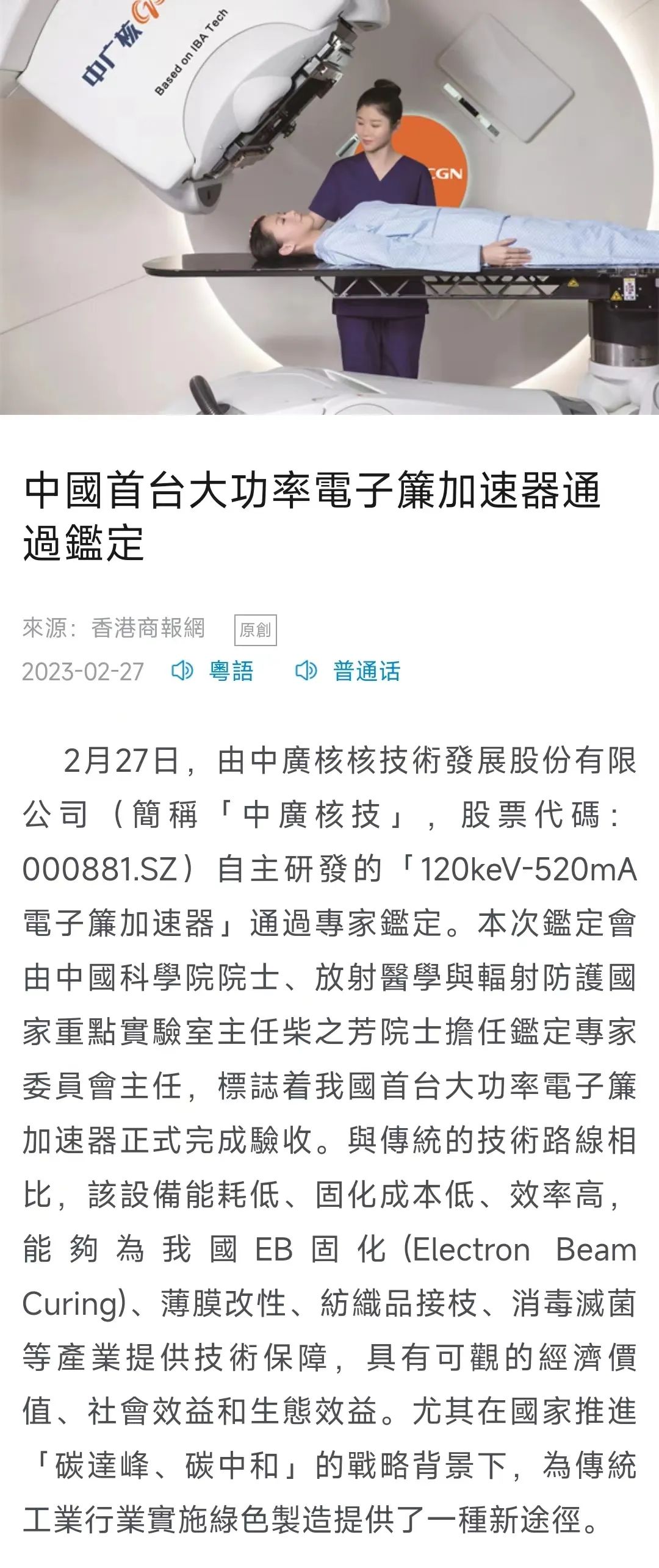 2月27日,由中廣核核技術(shù)發(fā)展股份有限公司(股票代碼:000881.SZ)聯(lián)合中科院近物所研發(fā)的“120keV-520mA電子簾加速器”通過專家鑒定。本次鑒定會由同輻行業(yè)協(xié)會組織,中國科學院院士、放射醫(yī)學與輻射防護國家重點實驗室主任柴之芳院士擔任鑒定專家委員會主任,標志著我國首臺大功率電子簾加速器正式完成驗收。與傳統(tǒng)的技術(shù)路線相比,該設(shè)備能耗低、固化成本低、效率高,能夠為我國EB固化(Electron Beam Curing)、薄膜改性、紡織品接枝、消毒滅菌等產(chǎn)業(yè)提供技術(shù)保障,具有可觀的經(jīng)濟價值、社會效益和生態(tài)效益。尤其在我國推進“碳達峰、碳中和”的戰(zhàn)略背景下,為傳統(tǒng)工業(yè)行業(yè)實施綠色制造提供了一種新途徑。