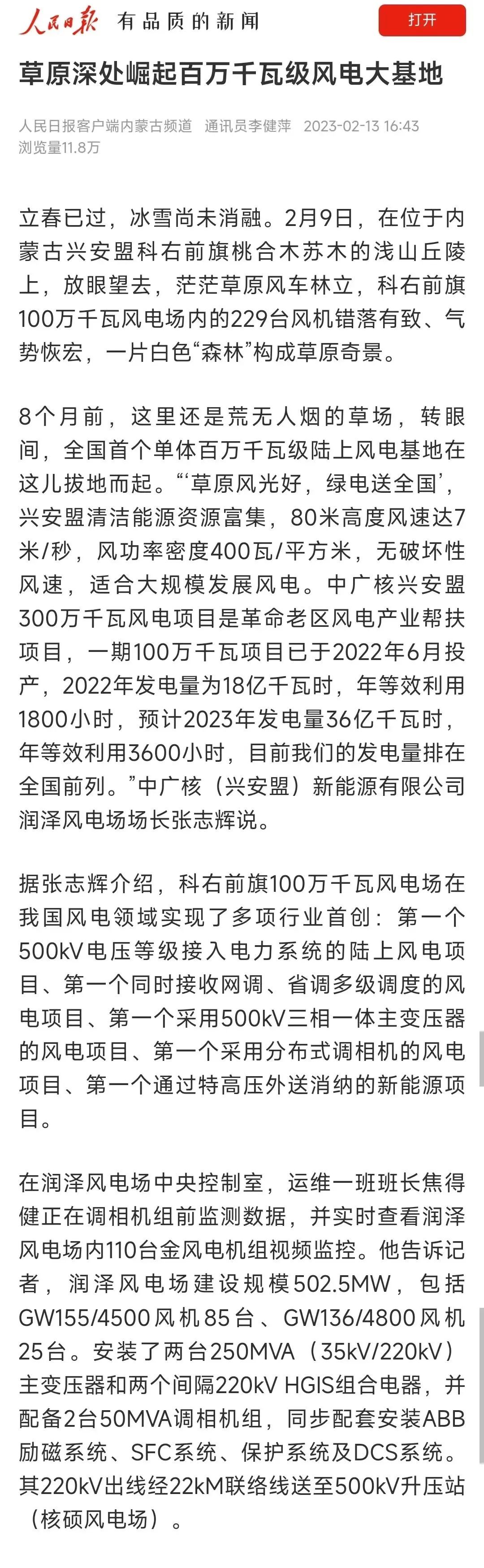 中廣核內(nèi)蒙古興安盟300萬千瓦風(fēng)電基地是革命老區(qū)風(fēng)電產(chǎn)業(yè)幫扶項目,一期100萬千瓦項目是我國投產(chǎn)的首個單體百萬千瓦級陸上風(fēng)電基地,自投運至今,累計上網(wǎng)電量超過25.7億千瓦時,具有良好的經(jīng)濟(jì)效益和環(huán)保效益。