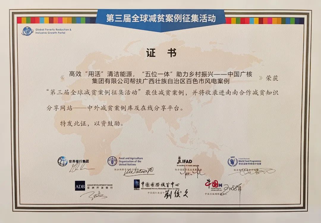 項目創(chuàng)新采用“入股分紅+贈股分紅+保底收益”特色幫扶模式,由中廣核和樂業(yè)縣63個村集體共同持股,2022年9月16日,項目一期為63個村首次分紅共計458萬元,平均每個村集體增收超7萬元,極大增強(qiáng)村集體經(jīng)濟(jì)實力,項目還榮獲第三屆全球減貧案例征集活動“最佳減貧案例”。