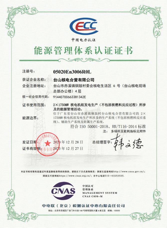 近日,臺山核電獲得由中電聯(lián)(北京)檢測認證中心有限責(zé)任公司簽發(fā)的《能源管理體系認證證書》,順利完成重點能耗單位能源管理體系認證工作。