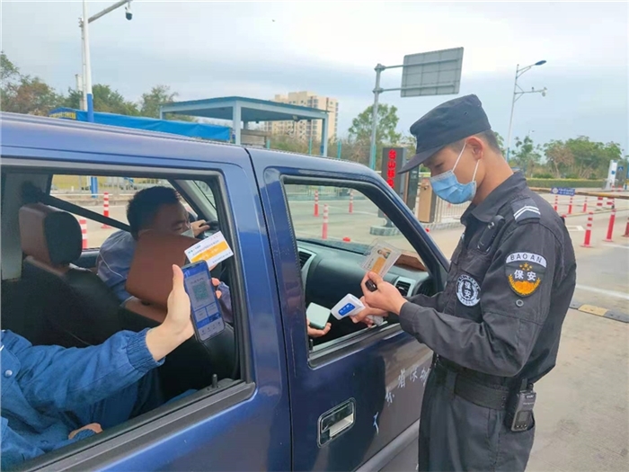 ▲1號(hào)門崗執(zhí)勤保安在查驗(yàn)入場(chǎng)人員防疫證件和健康碼。