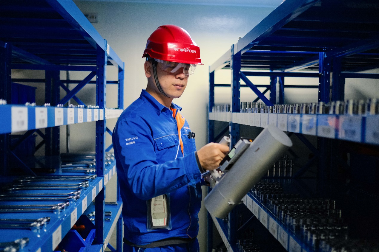 在核島工器具庫,來自安全防護部的鄧瑞金正在進行核島工器具檢查,確保工作人員使用的工具是安全可靠的。