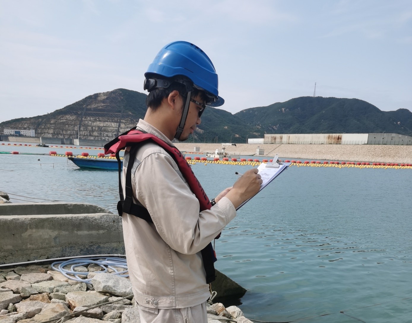 我是來自生產服務部的梁嘉輝,五一值班期間主要負責冷源應急值班工作。為應對五一保電期間可能出現(xiàn)的海生物爆發(fā)情況,冷源攔截設施運維項目保持每天對攔截網進行清理,確保冷源安全。