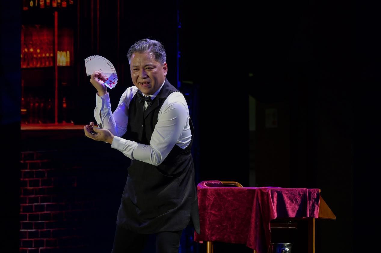 演員楊杰為大家?guī)砟g(shù)表演《快樂的服務(wù)員》,與臺(tái)下觀眾頻頻互動(dòng)。